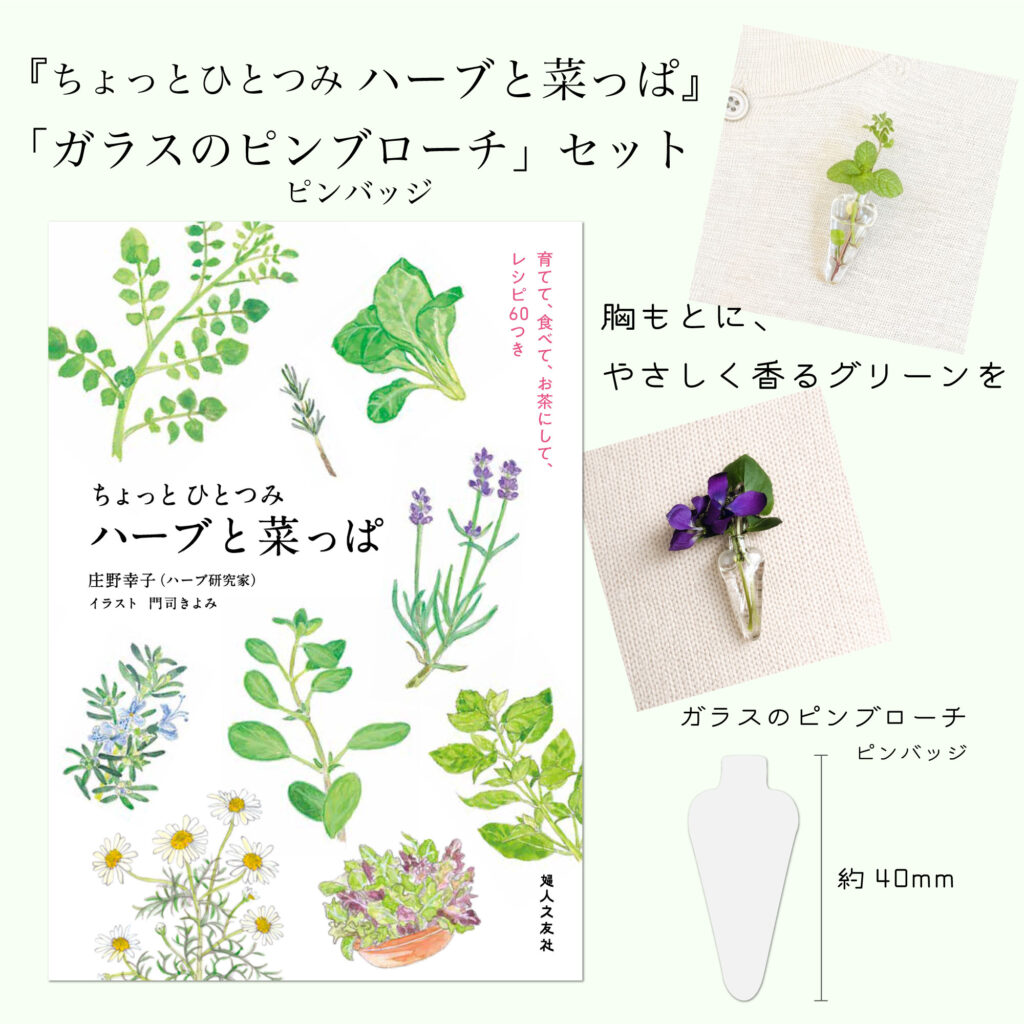 3月31日発売の『ちょっとひとつみ ハーブと菜っぱ』と、「ガラスのピンブローチ(ピンバッジ)」をセットにしました。