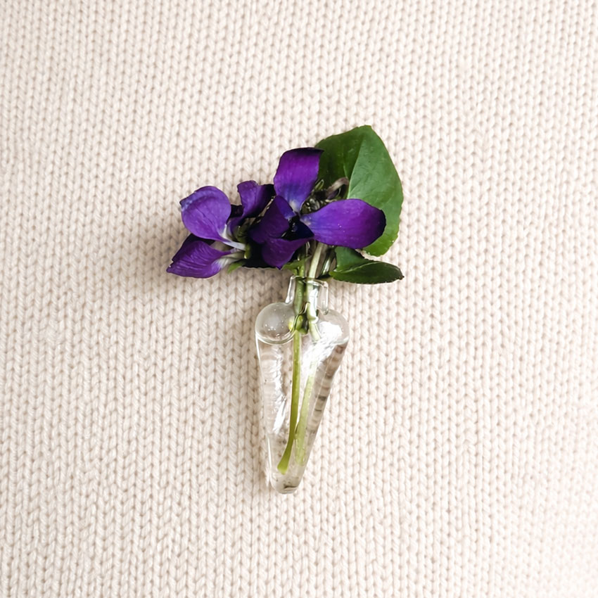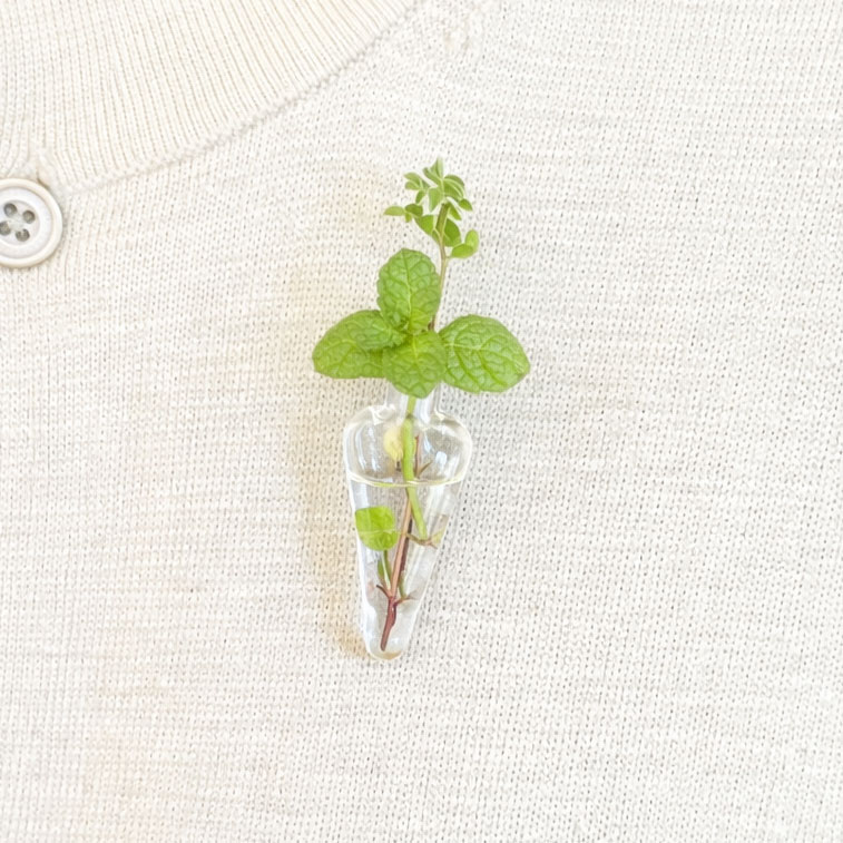 ガラスのピンブローチ… 生花をいけることができるアクセサリーです。本体の七分目ぐらいまで水を注ぎ小さめで軽いお花をいけてお使いください。ハーブを挿せば、香りも楽しめるブローチ。 水はこぼれにくい構造ですが、取り扱いにはご注意ください。 |