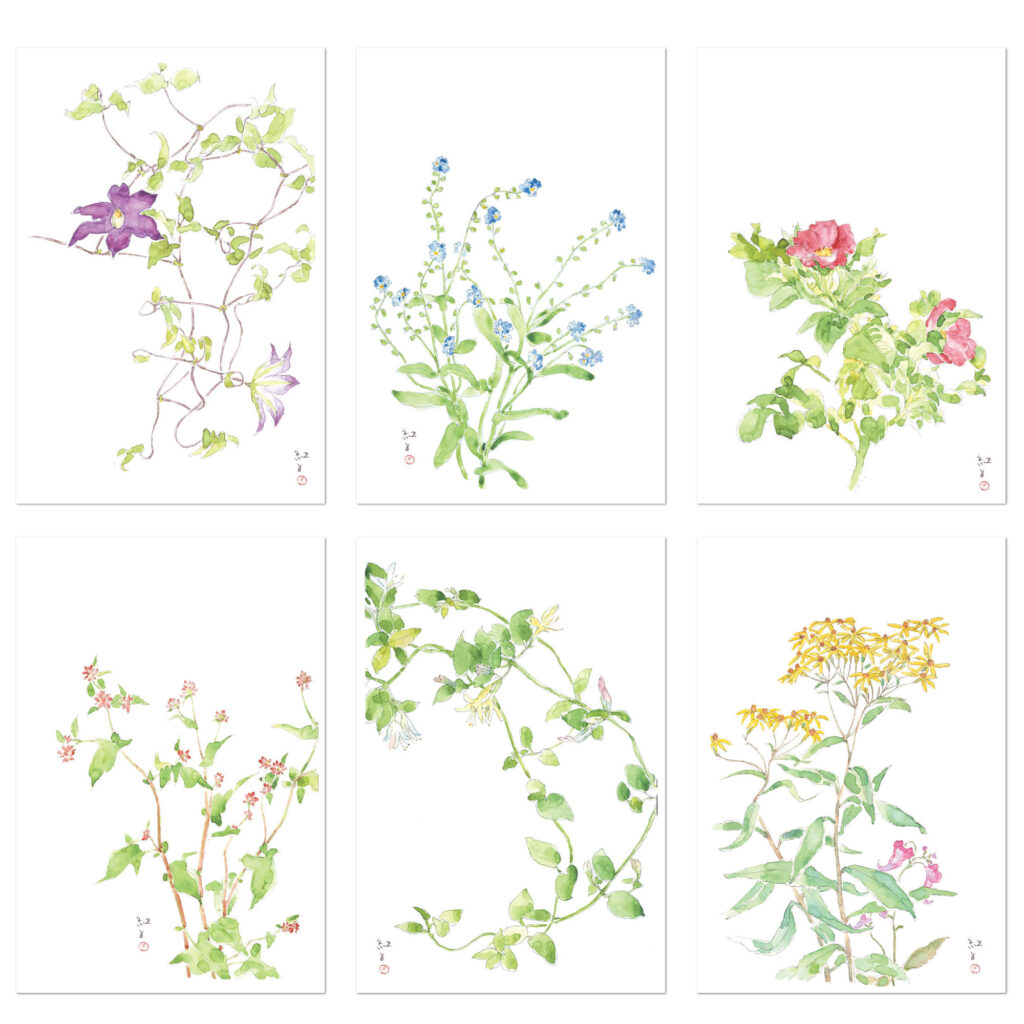 「3年連用花日記」の挿画の中から春と夏の花でポストカードをつくりました。