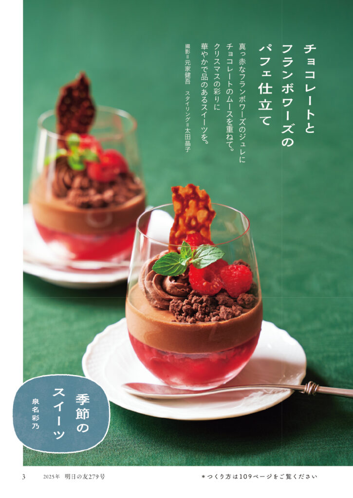 | 003 | 季節のスイーツ チョコレートとフランボワーズのパフェ仕立て 泉名彩乃 |