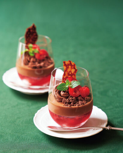 真っ赤なフランボワーズのジュレにチョコレートのムースを重ねて。クリスマスの彩りに華やかで品のあるスイーツを。