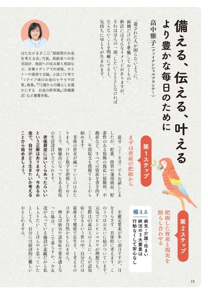 | 070 | 新連載 シニアとお金 生きるって、お金がかかる 山﨑美津江 |