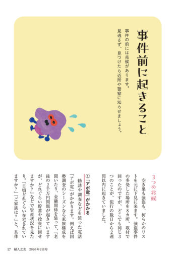 事件の前には兆候があります。見逃さず、見つけたら近所や警察に知らせましょう。