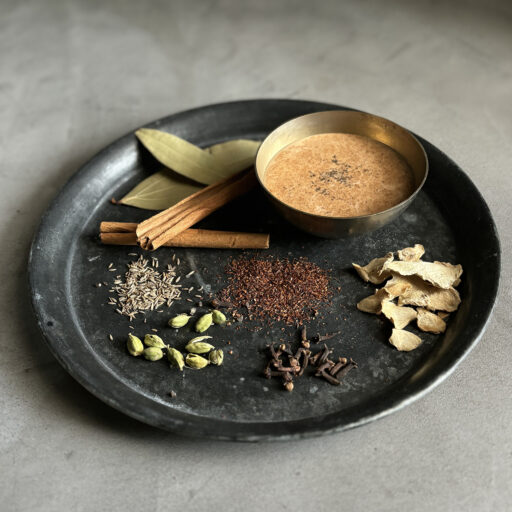 ノンカフェインのルイボスティー茶葉に、マサラチャイのスパイス=シナモン、カルダモン、ジンジャー、クミン、ナツメグ、クローブ、テジパットをブレンド。心落ち着くスパイスの香りとやさしい口当たりのミルクティーは、深くおだやかな眠りへと誘います。