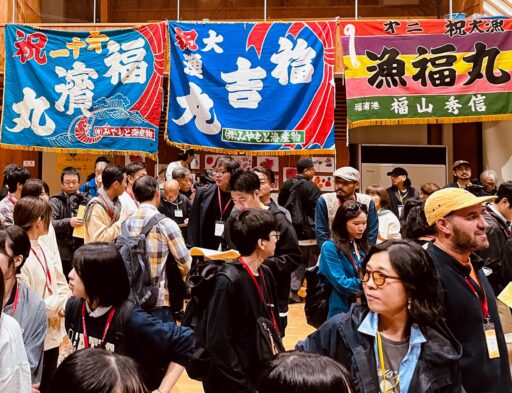 ホールには大漁旗。海外からの参加者も目を輝かせる