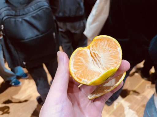 オープニングにはDJ のオリジナルソングが流れ、次いでウェルカムドリンクならぬ「ウェルカムみかん」が振る舞われた。このみかん、2人で1つを分け合うというのも見ず知らずの参加者同士の連帯感を高める。